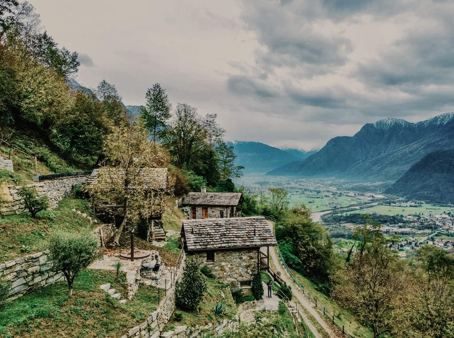 Ronco Nuovo ist der Name einer verlassenen Siedlung auf 550 Metern Höhe über dem Valchiavenna. Für viele Jahrhunderte wurde hier auf terrassiertem Gelände Wein, Obst und Gemüse angebaut, Vieh gehalten sowie Kastanienhaine gepflegt und somit die Familien versorgt. Und genau hier begann unser eigener Weg im Valchiavenna. Als wir 2017 hier ankamen, hatte die Wildnis die ehemalige Kulturlandschaft überwuchert. Aber die Magie dieses Orts war unverkennbar und zog uns in ihren Bann. So begannen wir mit dem Wiederaufbau von drei trockengemauerten Ställen.